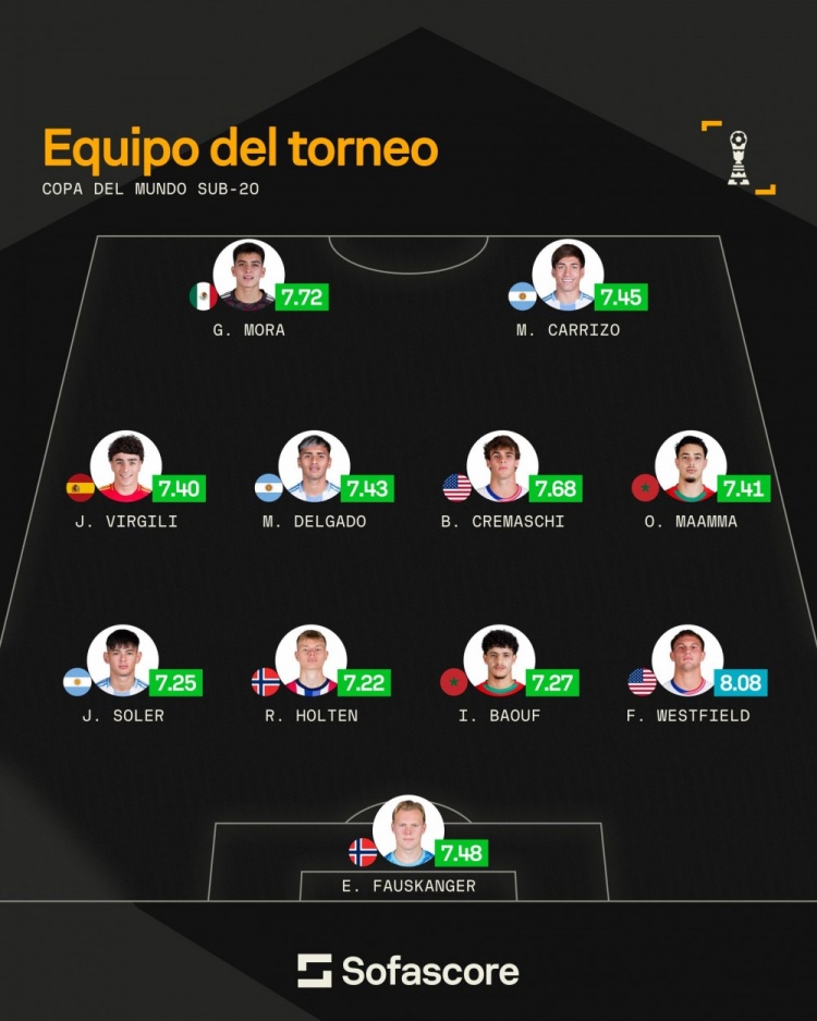 今日Sofascore根据球员评分评选出了本次世青赛最佳阵,摩洛哥两将玛玛、巴乌夫和阿根廷3将卡里佐、德尔加多和索莱尔领衔。具体如下: