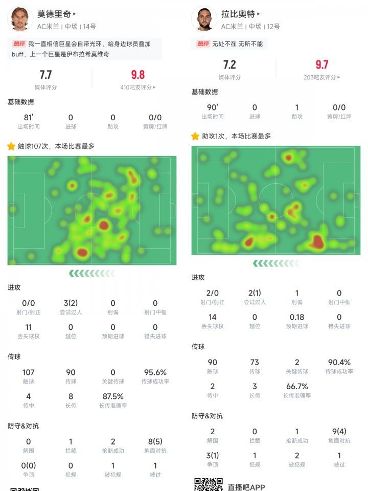本场赛事 米兰中场球员双核拉比奥特和莫德里奇表现出色,拉比奥特全场完成90次触球,73次传送球 并送出1次助功 ,传送球 成功率90.4%;莫德里奇更是完成了全场最高的107次触球,足球直播免费观看直播以高达95.6%的成功率送出了90次传送球 。