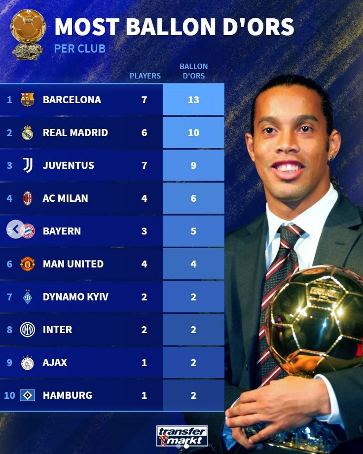 9月22日讯 金球奖颁奖典礼开幕在即,德转也盘点了在此前获得金球奖次数最多的俱乐部榜单,足球直播免费观看直播其中巴萨球员13次居首,具体如下: