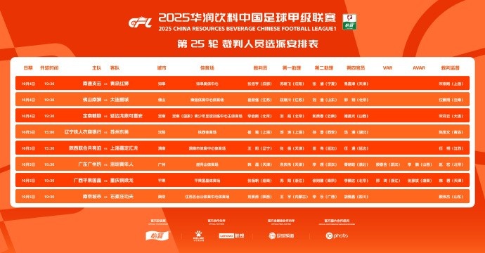 10月4日讯 2025华润饮料中甲职业联赛 第25轮裁判 选派结果公布,英超免费直播(无插件)广东广州豹vs深圳青年人、广西平果vs重庆铜梁龙两场争二关键战均安排有VAR裁判 。