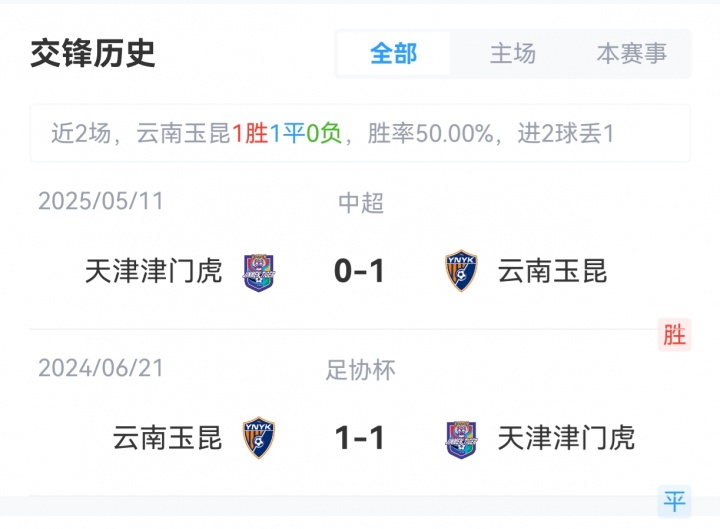 云南玉昆8胜8平10负积32分,排名中超第10;天津津门虎12胜7平7负积43分,排名中超第6。