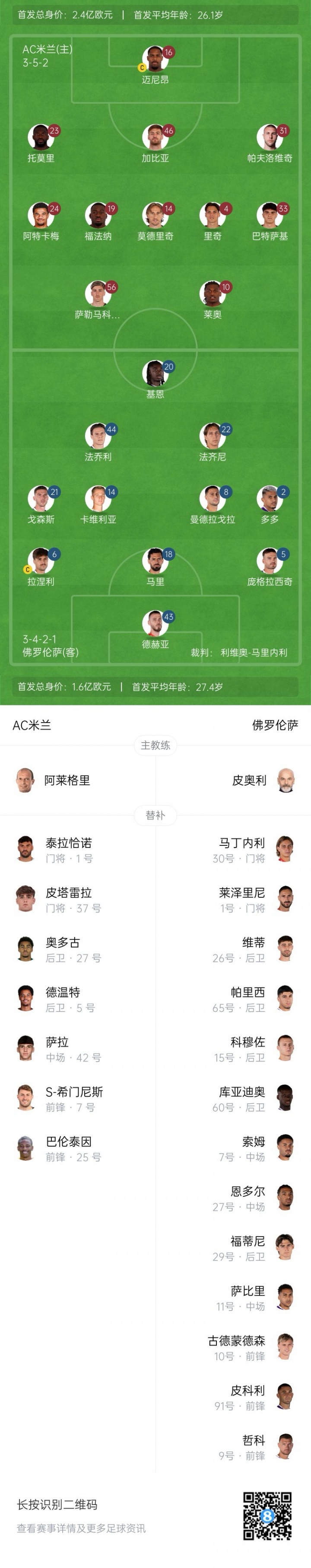 佛罗伦萨后备 :30-托马索·马丁内利、1-莱泽里尼、26-马蒂亚·维蒂、65-帕里西、15-科穆佐、60-库亚迪奥、7-索姆、27-恩多尔、29-福蒂尼、11-萨比里、10-古德蒙德森、91-皮科利、9-哲科