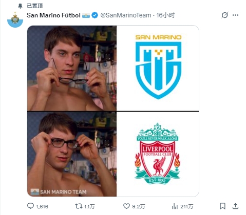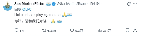 这引发了各界对利物浦的广泛批评。而FIFA目前排名倒数第一的圣马力诺也没有错过这波“天降的流量”,欧冠资格赛直播他们在官方社媒上发布了一张调侃利物浦和自己实力相当的梗图,又在评论区@了利物浦的官方账号,说:“你好,请和我们来踢一场。”