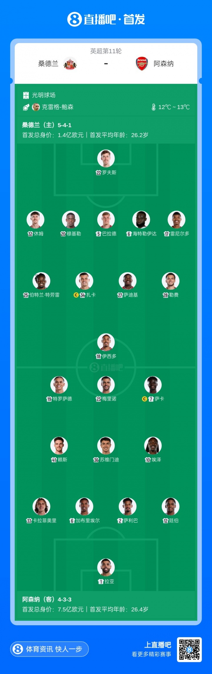 桑德兰杆位:22-罗夫斯、5-巴拉德、6-海特勒伊达、17-雷尼尔多、20-穆基勒、32-休姆、27-萨迪基、28-勒费、34-扎卡、18-伊西多、25-波特兰·特劳雷