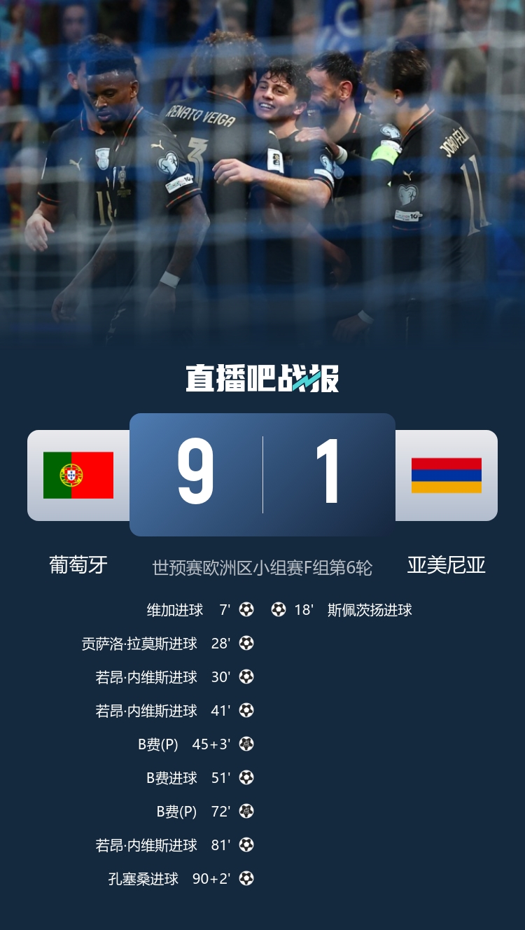 世预赛欧洲区小组赛F组第6轮,葡萄牙9-1狂胜亚美尼亚,B费、若昂·内维斯独中三元。
