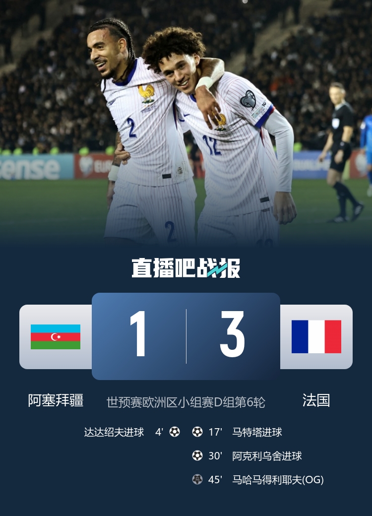 世预赛欧洲区小组赛D组第六轮,法国3-1反转 阿塞拜疆,古斯托2助功 ,马特塔得分 。