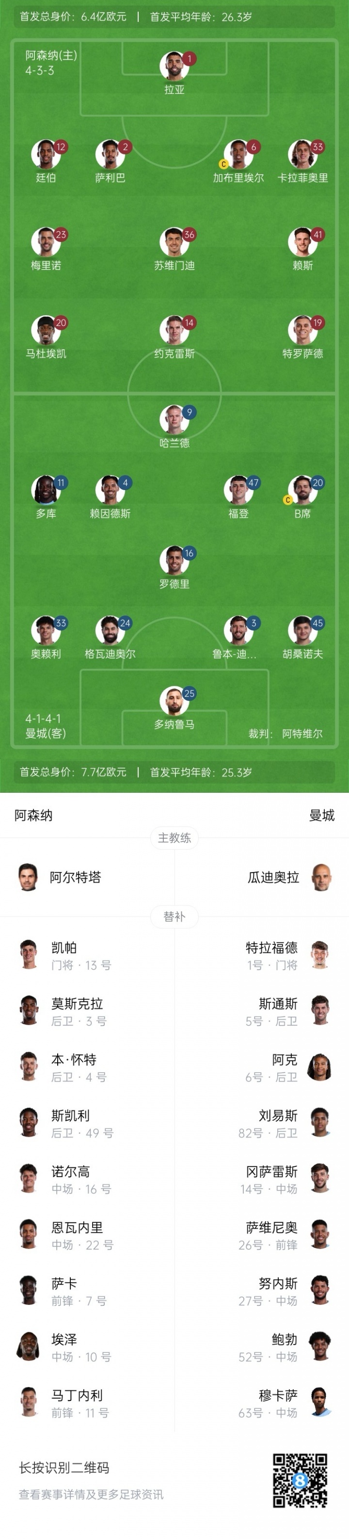 阿森纳后备 :13-凯帕、3-莫斯克拉、4-本怀特、7-萨卡、10-埃泽、11-马丁内利、16-诺尔高、22-恩瓦内里、49-斯凯利
