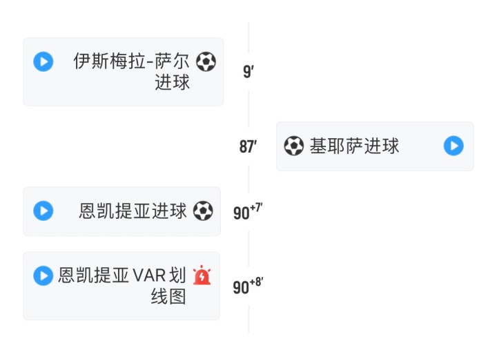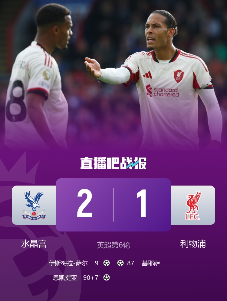 水晶宫2-1利物浦,第87分钟基耶萨得分 ,第97分钟恩凯提亚得分 ↓