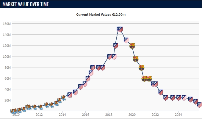 10月03日讯 德转昨日更新了西甲职业联赛 的球员身价,34岁的格列兹曼身价继续下跌,还剩1200万欧。