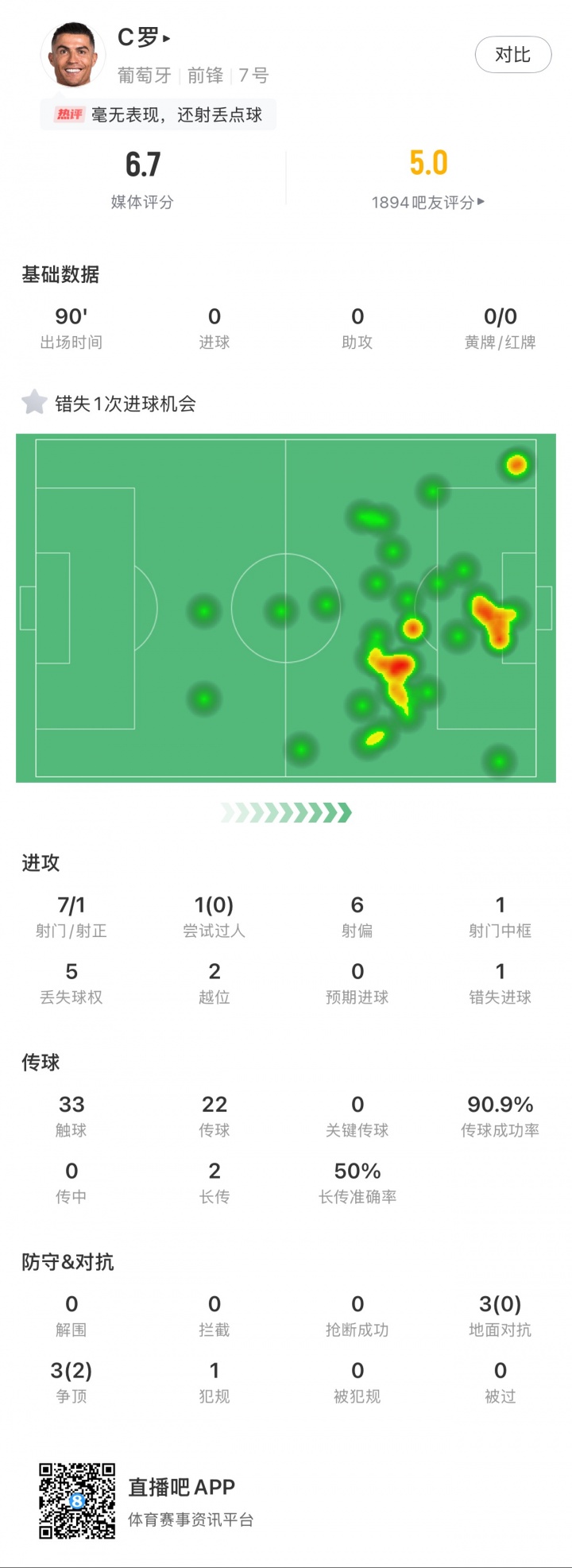 本场赛事 ,40岁C罗杆位打满全场,7次射球 6次射偏(1次中框),欧冠资格赛直播仅十二码球射正但失点。此外,C罗2次越位违例 ,5次丢失球权,1次尝试过人失败,3次地面对峙 全失败。