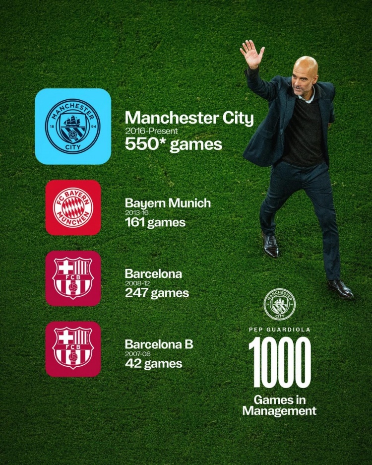 瓜迪奥拉执教千场分布: