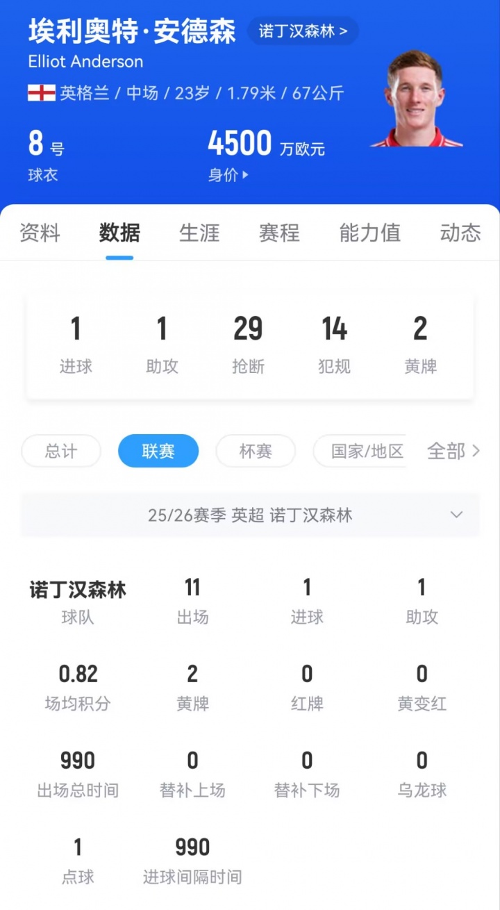 23岁的森林中场球员埃利奥特·安德森本赛季为森林在职业联赛 已出场11次,贡献1球1助功 。目前他的德回转 价为4500万欧元。
