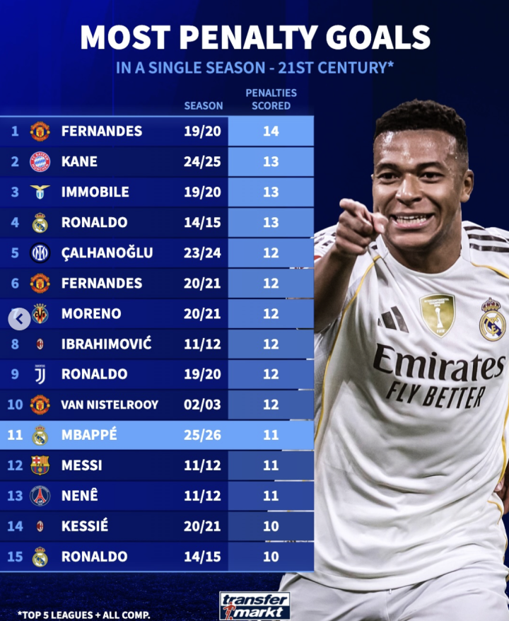 19/20赛季的B费打入14粒十二码球居首。24/25赛季的凯恩、19/20赛季的因莫比莱和14/15赛季的C罗各打入13球位居二到四位。