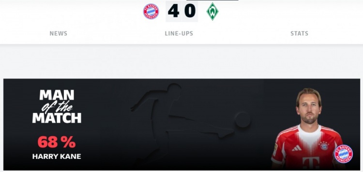 9月27日讯 官方消息,凯恩当选拜仁4-0云达不莱梅的全场最佳球员。