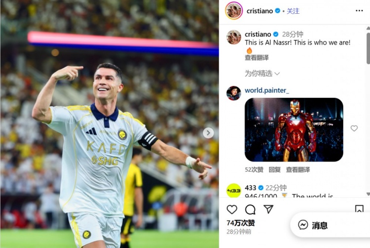 9月27日讯 在利雅得获胜 2-0击败吉达联合后,C罗更新了社交媒体。