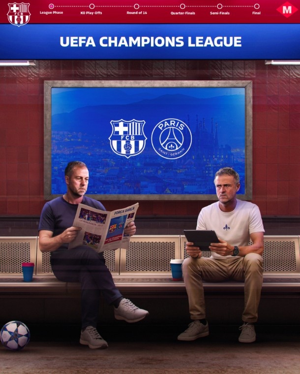 10月1日讯 巴萨发布欧冠对阵巴黎海报,两队主指导教练员出镜亮相。