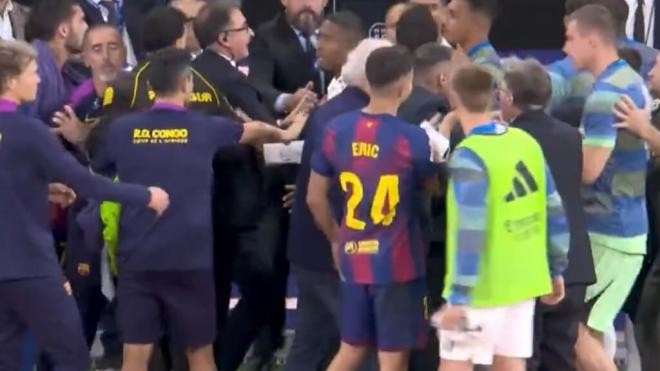 10月27日讯 据西媒eldesmarque报道,国家德比赛事 临近结束时,巴萨中场球员佩德里吃到第二张警告 被罚下场,这一事件成为了“导火索”,直接引发了双方后备 席人员的“大规模混战”。场面一度失控,以至于安保不得不快速 介入,jrs直播nba(无插件)直播强行将两队后备 席分隔开。