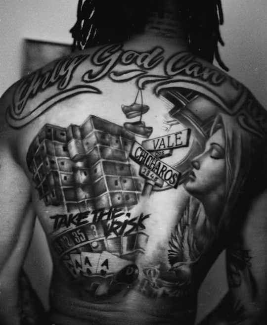 莱奥纹身的右侧是圣母玛利亚的头像,欧洲杯直播左侧是他从小生活的街区图,中间还有两块路标,上面写着莱奥家乡塞图巴尔区的邮编2845。纹身的左下方是一句口号“冒险”,旁边是轮盘赌和四张A扑克牌。