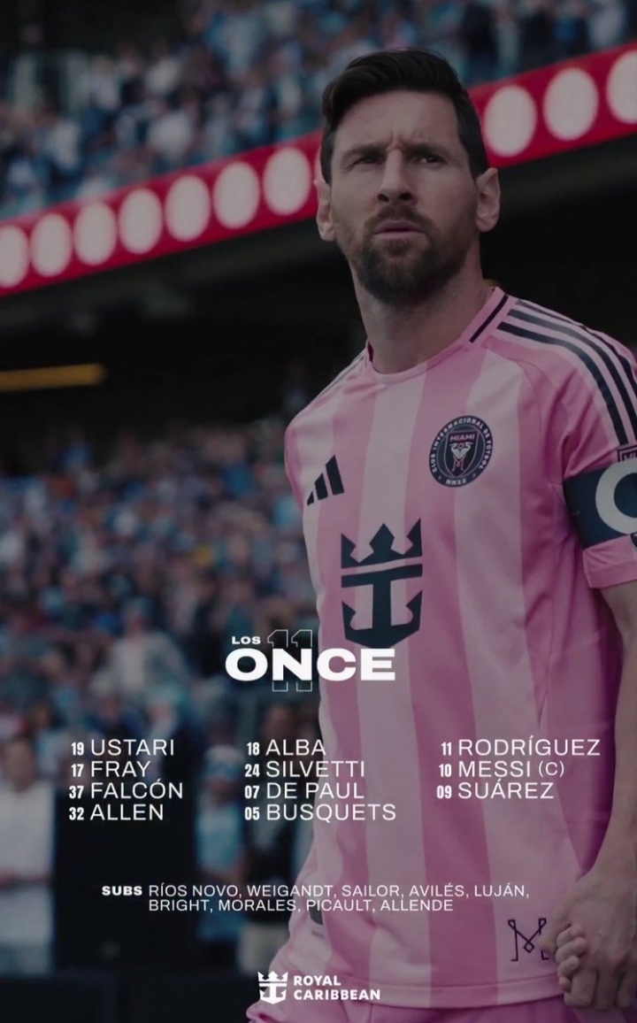 迈阿密国际杆位:19-乌斯塔里、18-阿尔巴、17-弗雷、37-法尔肯、32-阿伦、24-马特奥·西尔维蒂、7-德-保罗、5-布斯克茨、11-B·罗德里格斯、10-梅西、9-苏亚雷斯