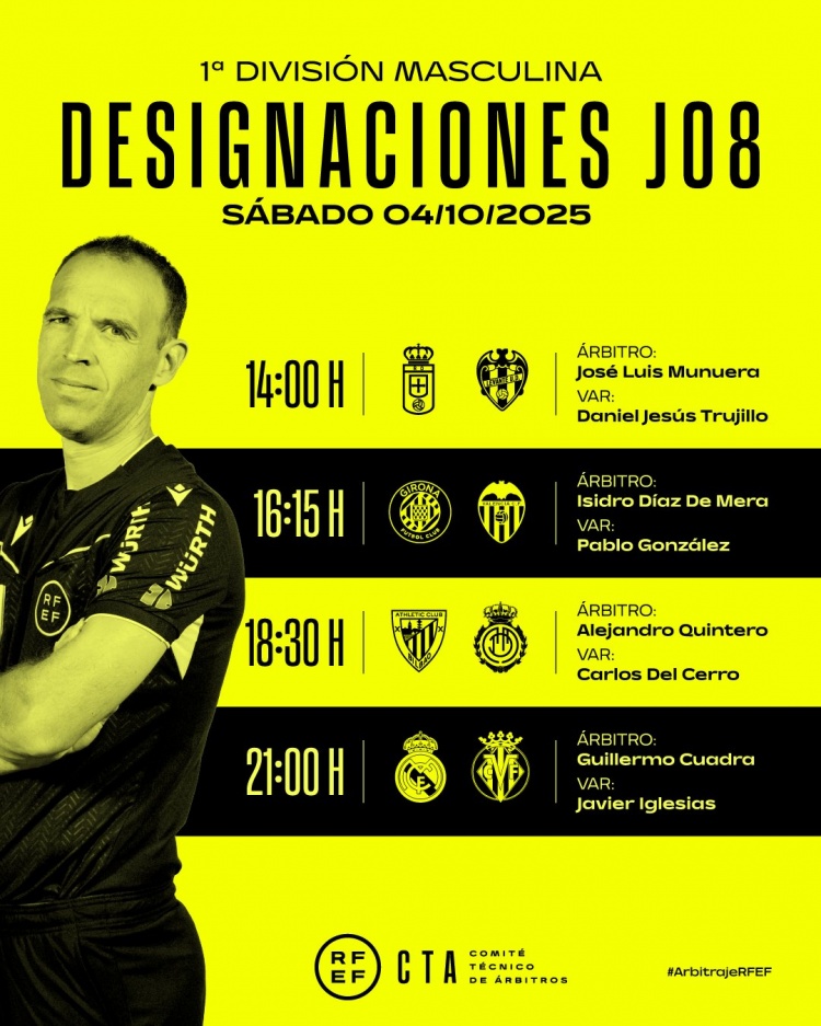 10月3日讯 西甲官方公布了10月4日赛事 的裁判 安排,足球直播高清免费观看夸德拉执法皇马vs比利亚雷亚尔。
