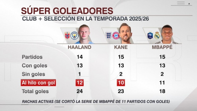10月23日讯 ESPN统计了哈兰德、凯恩、姆巴佩本赛季俱乐部+国家队的数据,并做出对比。