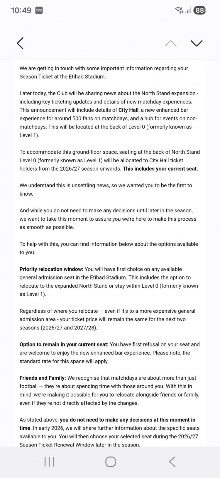 曼城俱乐部已通知部分季票持有者,由于北看台扩建计划,他们当前的座位将受到影响。俱乐部将在北看台0层——原1层——后部新建一个名为“市政厅”City Hall的增强型酒吧感受 区及活动中心,该区域从2026/27赛季起将分配给新的持票人,这直接影响了收到通知球迷的现有座位。